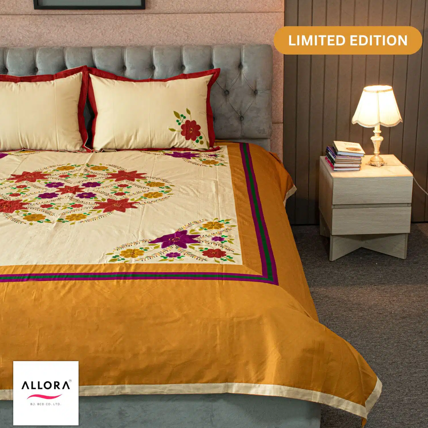 This Limited Edition Embroidered Bed Sheet blends mustard gold and cream with vibrant floral embroidery — a design that feels both traditional and timeless.