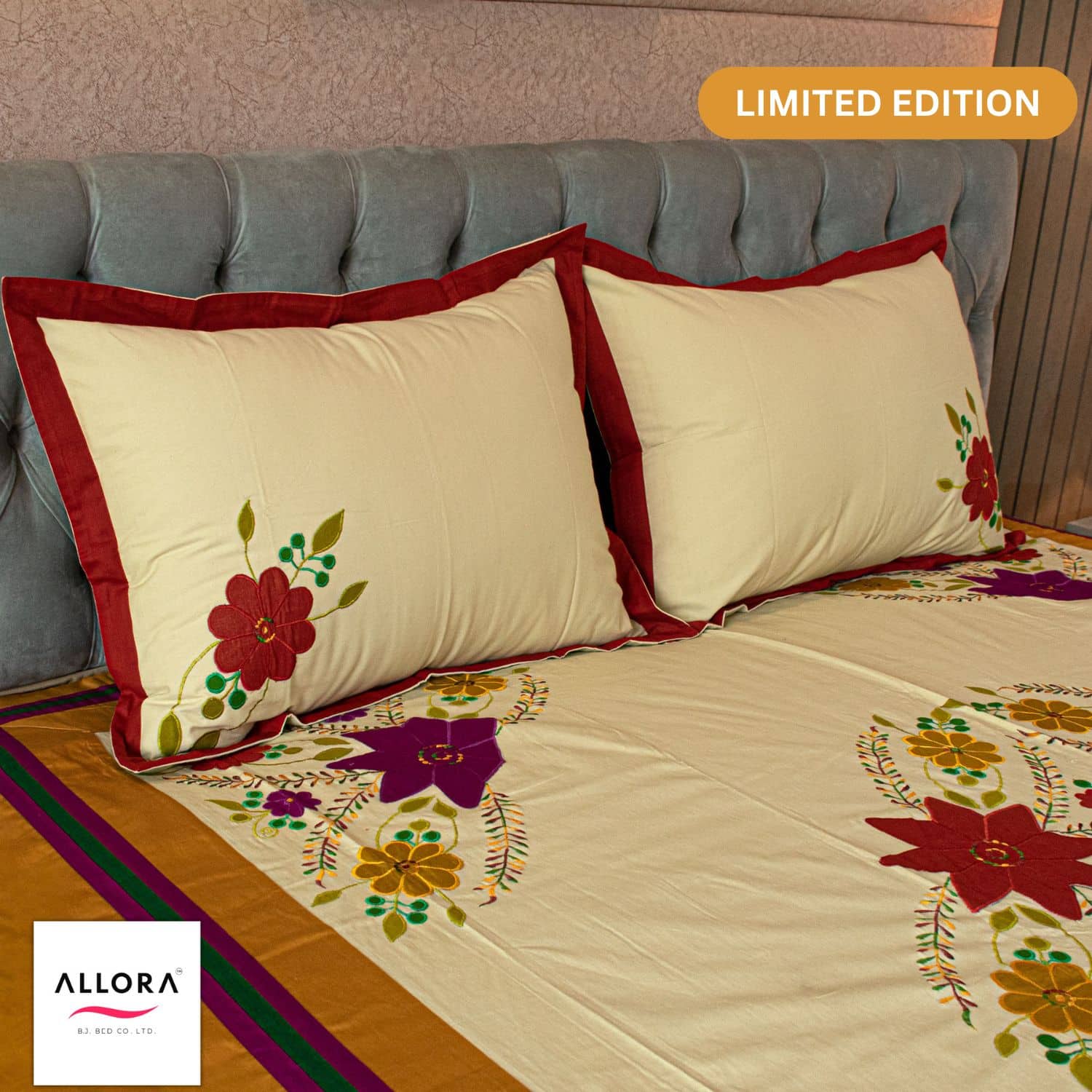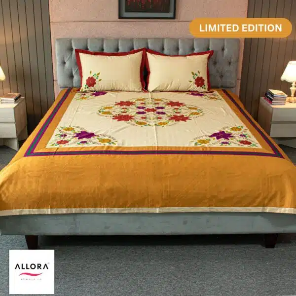 This Limited Edition Embroidered Bed Sheet blends mustard gold and cream with vibrant floral embroidery — a design that feels both traditional and timeless.