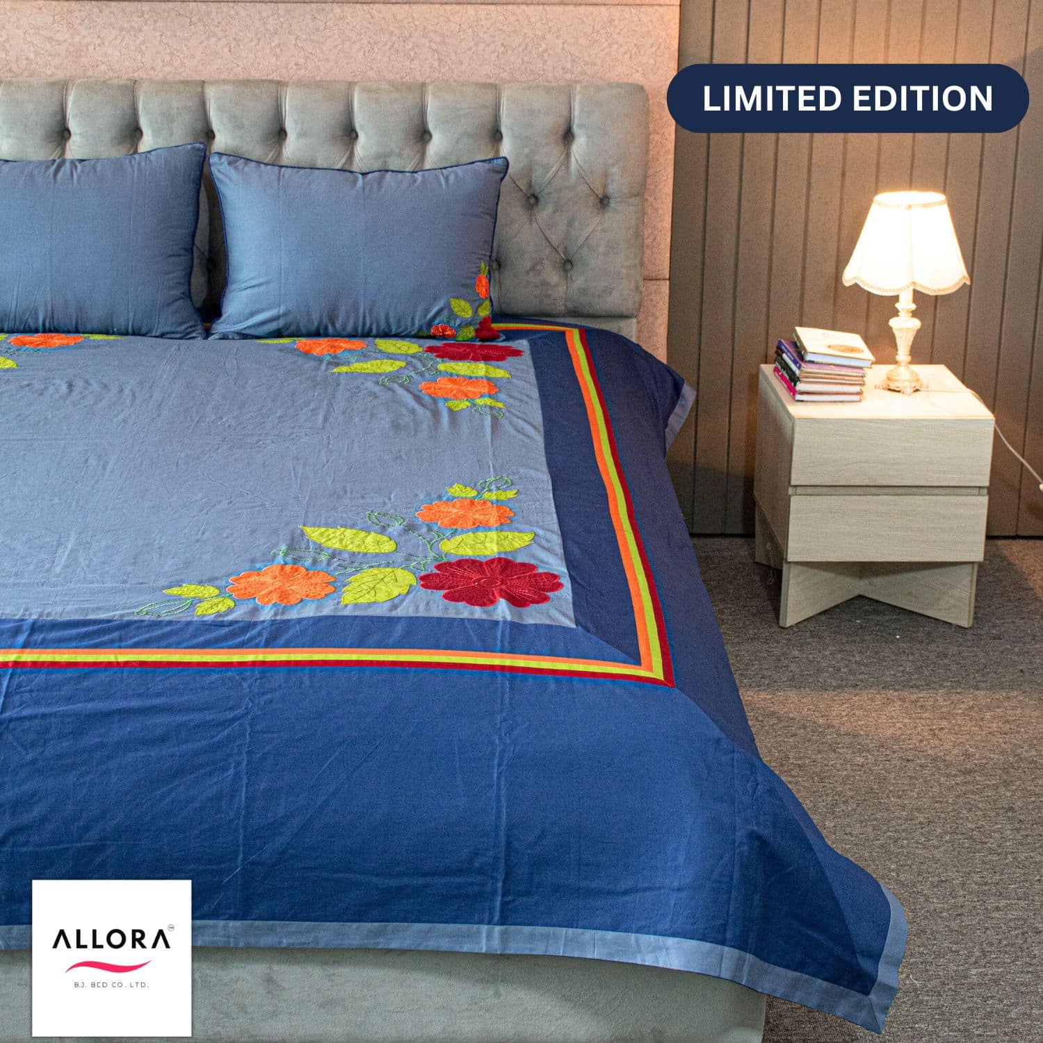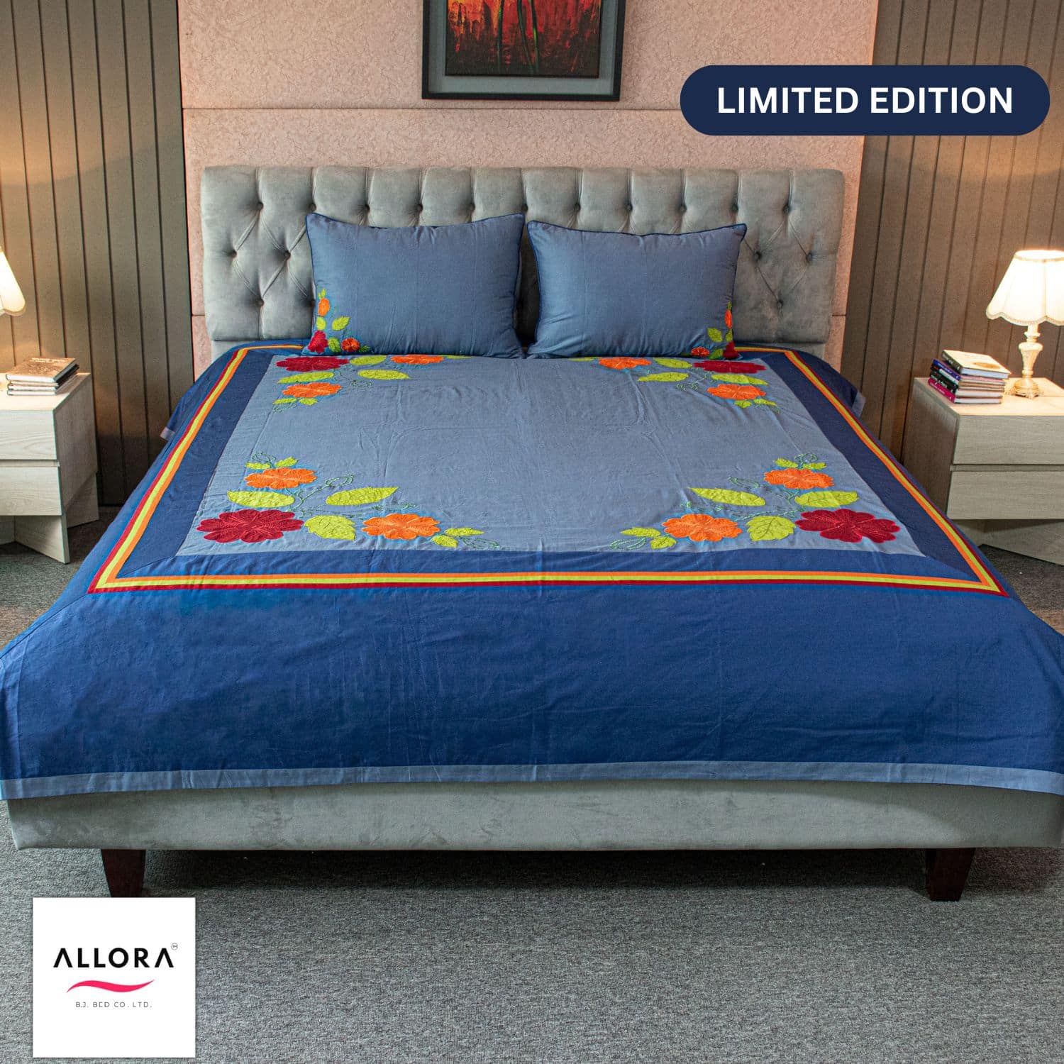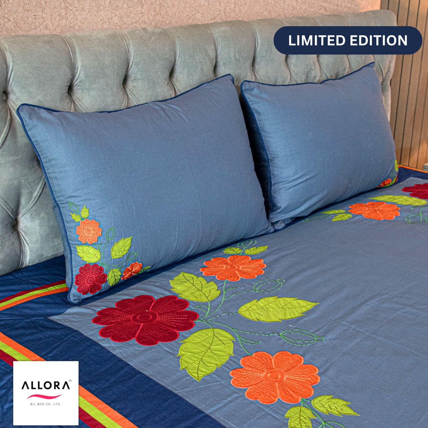 This Limited Edition Embroidered Bed Sheet blends deep navy and sky blue tones with vibrant floral embroidery — adding a refreshing splash of color to your cozy corner.