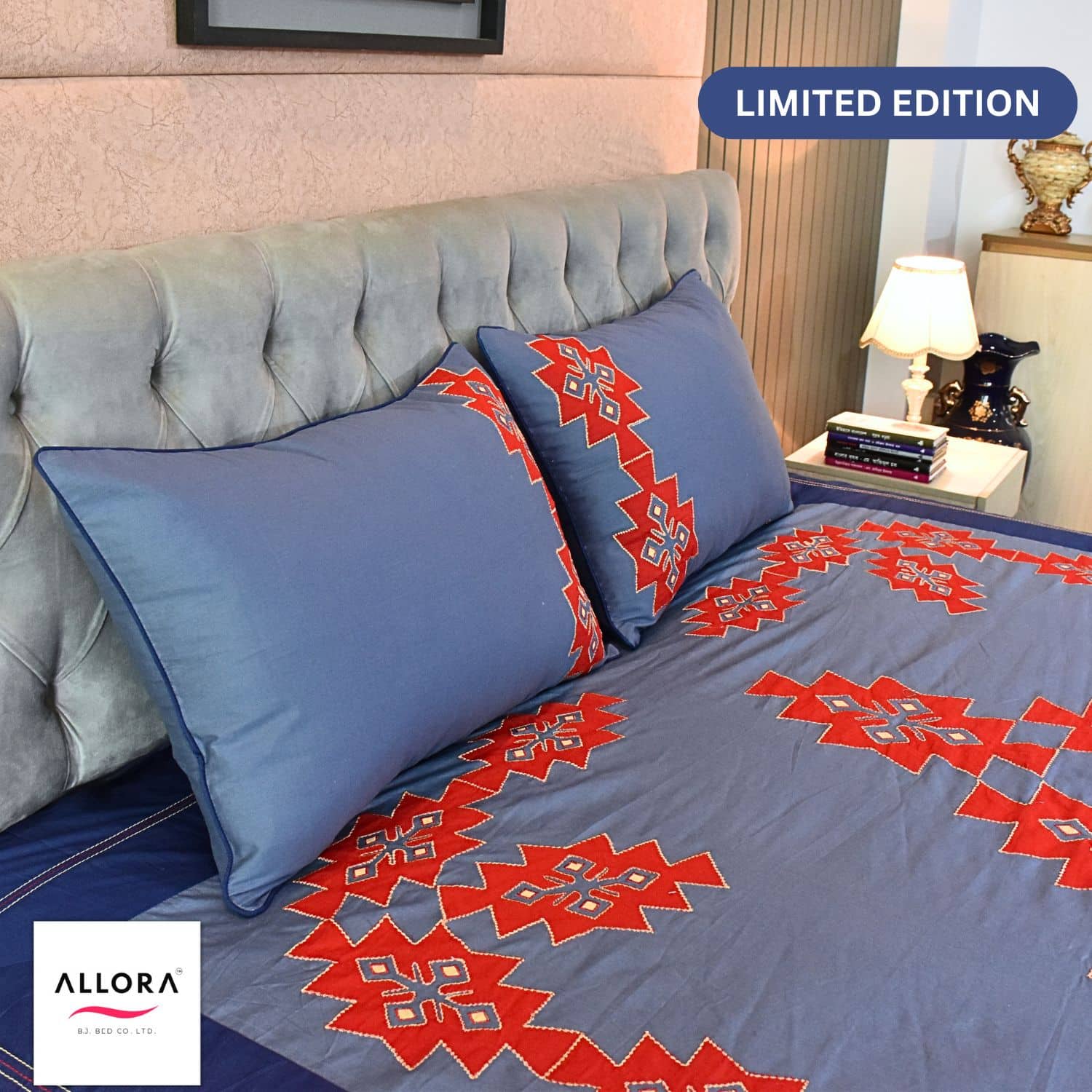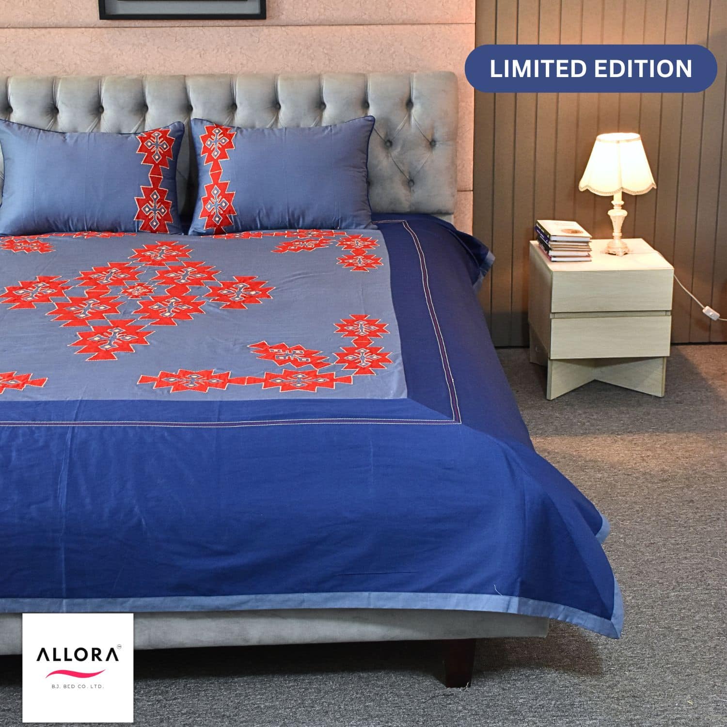 Say hello to our Limited Edition Embroidered Bed Sheet — a bold mix of deep navy blue with fiery red geometric embroidery that instantly lights up your room.